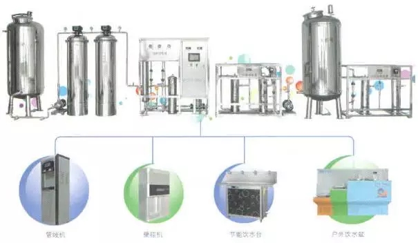 中央凈水設(shè)備:自來水→中央凈水機 [原水箱→原水泵→多介質(zhì)過濾器(或石英砂過濾器)→活性炭過濾器→(軟化器)→超濾器(或保安過濾器)→高壓泵→反滲透(或納濾、超濾)裝置→純凈水箱→變頻泵組] →純凈水輸送管網(wǎng)→終端飲水機