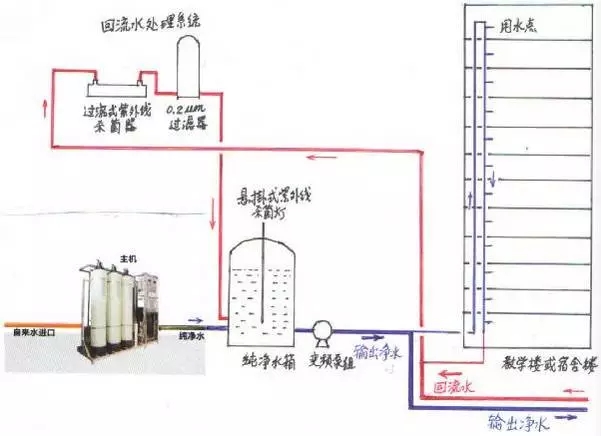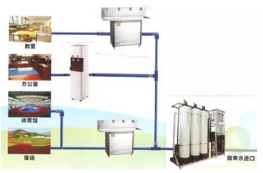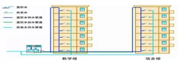 建立中央凈水設(shè)備系統(tǒng),由中央凈水機生產(chǎn)凈水,通過循環(huán)管網(wǎng)輸送至每棟教學(xué)樓、宿舍樓、辦公樓的每個樓層的飲水點的終端飲水機,并有余水回流至中央凈水機。中央凈水機可考慮布置在學(xué)校的某棟樓宇的地下室或閑置的小房間內(nèi),用水點的布置可考慮在每棟教學(xué)樓和宿舍樓的每個樓層的走廊或衛(wèi)生間附近布置一臺帶有加熱功能的多龍頭終端飲水機,而教師辦公樓則可考慮每個辦公室接一臺帶有加熱功能的單龍頭或多龍頭終端飲水機。另外還可在操場布置室外飲用水點,方便學(xué)生運動后及時補充流失的水份。