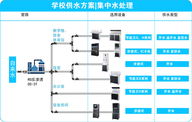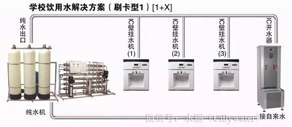 設(shè)凈水主機房一個,安裝一套足夠容量的水處理設(shè)備(包括原水箱、純水箱和多級組泵等),然后通過PPR和PE飲水管輸送至教學(xué)區(qū)、宿舍區(qū)、辦公區(qū)、食堂和運動場等,終端安裝智能IC卡管線機或者開水器等產(chǎn)品配套,有熱水和常溫水同時供應(yīng),適合不同的季節(jié)飲水選擇。