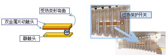 過熱保護開關安裝于電熱絲云母片支架上,由雙金屬片動觸頭和單金屬片靜觸頭構成。過熱時,由于壓合在一起的2種金屬片熱膨脹系數(shù)不同,因此雙金屬片受熱彎曲變形斷開電熱絲回路,電熱絲停止加熱,從而起到保護作用。示意圖如下圖所示